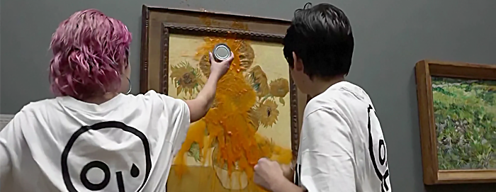 Já um outro ativista da organização antipetróleo atirou sopa de tomate contra o quadro e contra o parceiro que o acompanhava. Recuando a 14 de outubro, na National Galery, em Londres, duas jovens, de 20 e 21 anos, arremessaram sopa de tomate contra os girassóis de Vincent Van Gogh. Vídeos que circularam nas redes sociais permitiam ouvir o manifesto: "Como é que se sentem quando vêem algo belo e insubstituível a ser destruído à frente dos vossos olhos? Sentem-se indignados?